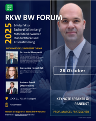 Wie gut ist unser Standort für die Zukunft des Mittelstands aufgestellt – und wie gehen Unternehmen mit der aktuellen Krisenstimmung um? Am 28. Oktober bringen wir im Look 21 in Stuttgart Entscheider:innen, Mittelständler und Expert:innen zusammen – mit spannenden Impulsen von u. a. Prof. Marcel Fratzscher, Präsident des Deutschen Instituts für Wirtschaftsforschung (DIW Berlin) und einer begleitenden Hausmesse.